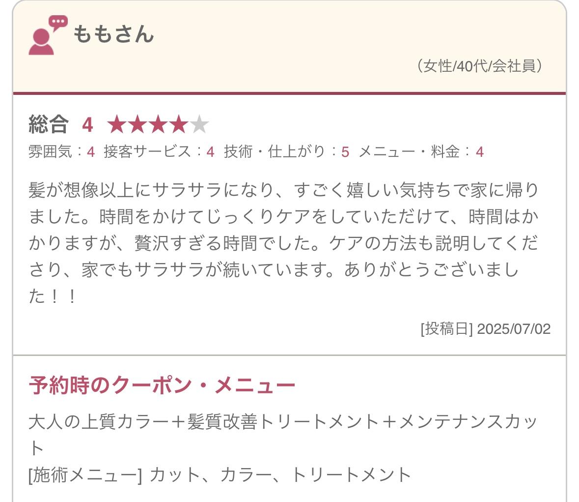 つまり、定期的な来店でしっかりと髪の評価を重ねることで、着実にあなたの理想の髪質へと変化させていくことができるのです。「前回よりも確実に髪が綺麗になっている」という、目に見える変化を実感していただけます。